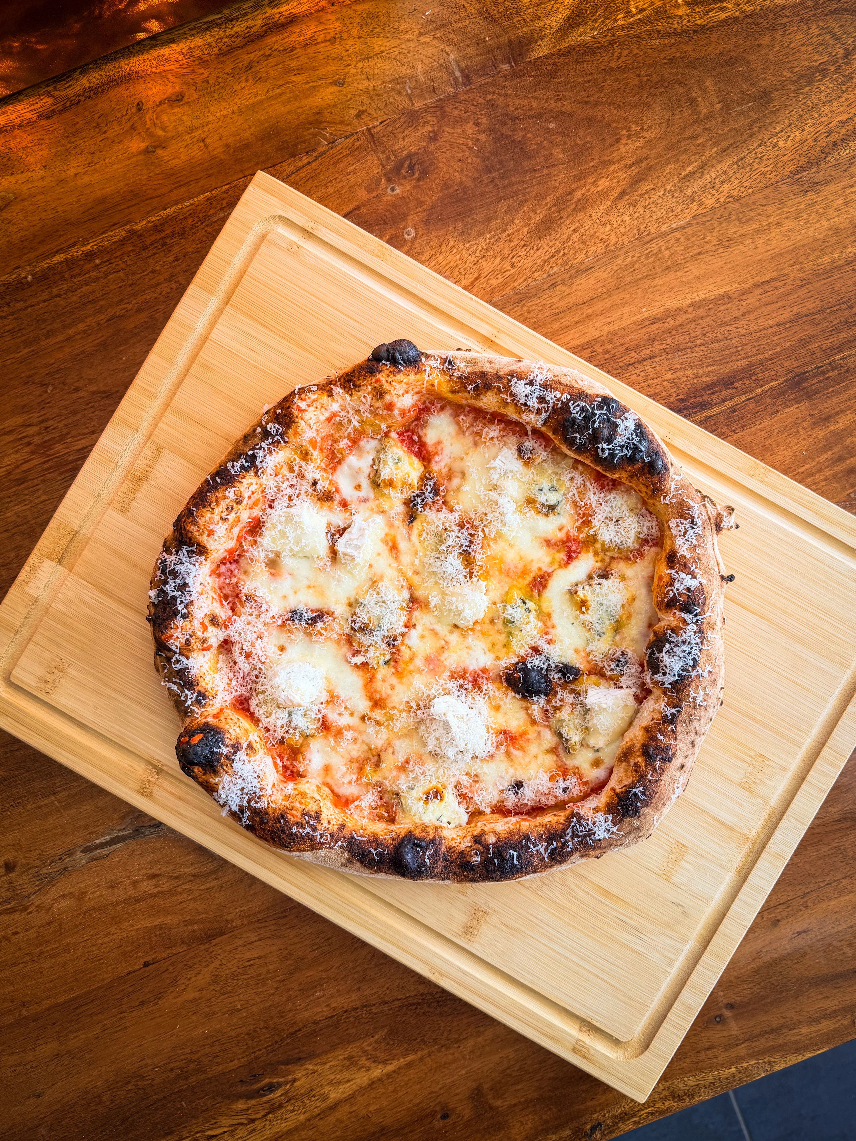 Tomate San Marzano DOP, Huile d’olive, Fior di Latte, Fourme d’Ambert, après cuisson Coulommiers, « Neige de Parmesan »
